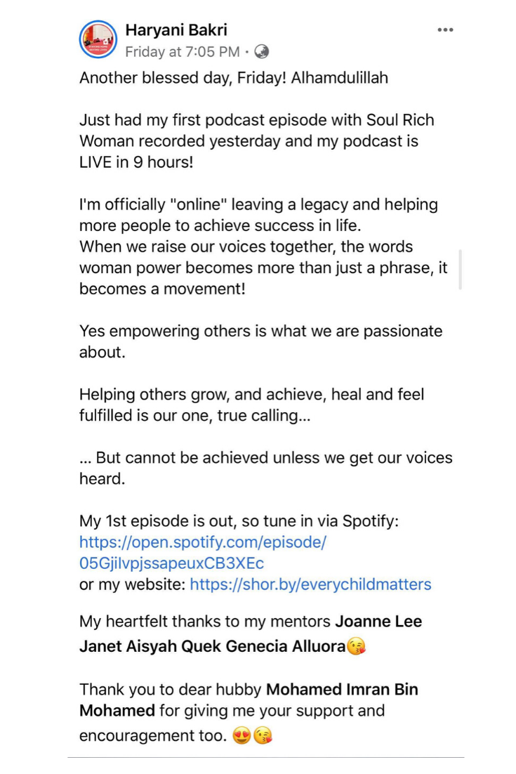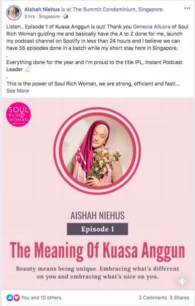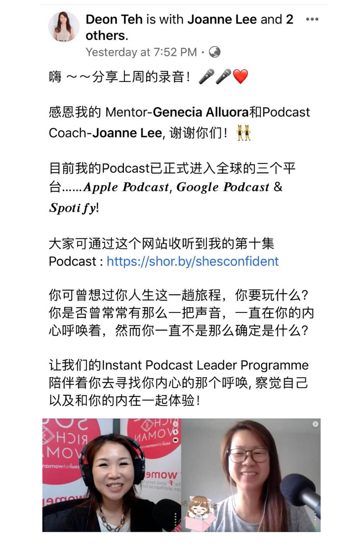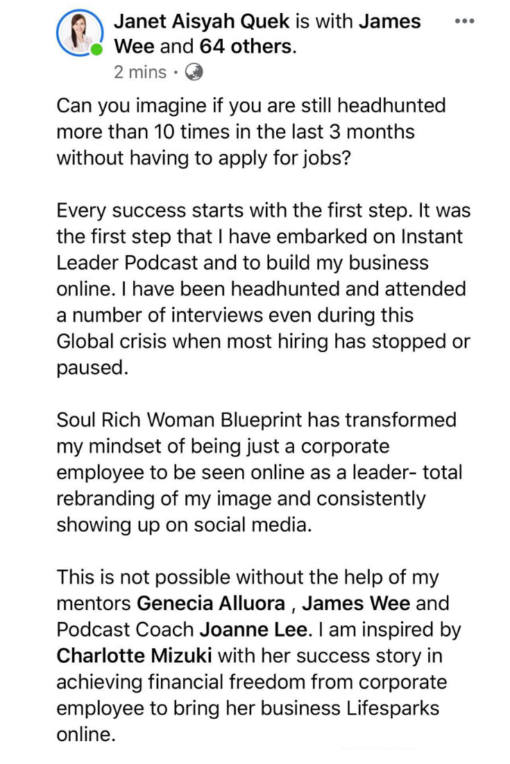 Janet Aisyah Quek had already started the Woman Leader Podcast, but Instant Podcast Leader® helped her landed more than 10x headhunted by regional companies from USA, Europe, etc with no pay cut and was offered even higher salary package — and was invited to National Achiever's Congress by Success Resources to speak alongside her mentor, Genecia Alluora.